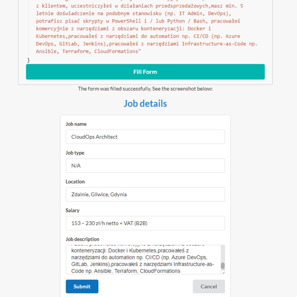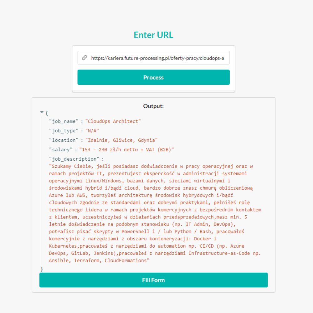 We created a simple web application that allows users to input the URL of a job offer they want to migrate to the new partner system. After pasting the direct web link, we simply press the “Process” button to begin.