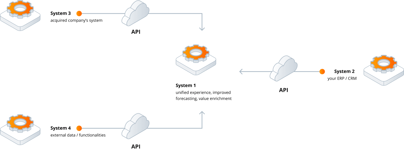 Our comprehensive Systems Integration Framework will allow you to enrich your primary applications with new functionalities, avoid data duplication and possible mistakes during entering information manually into one or more systems, optimise costs, and increase their value for your end users.