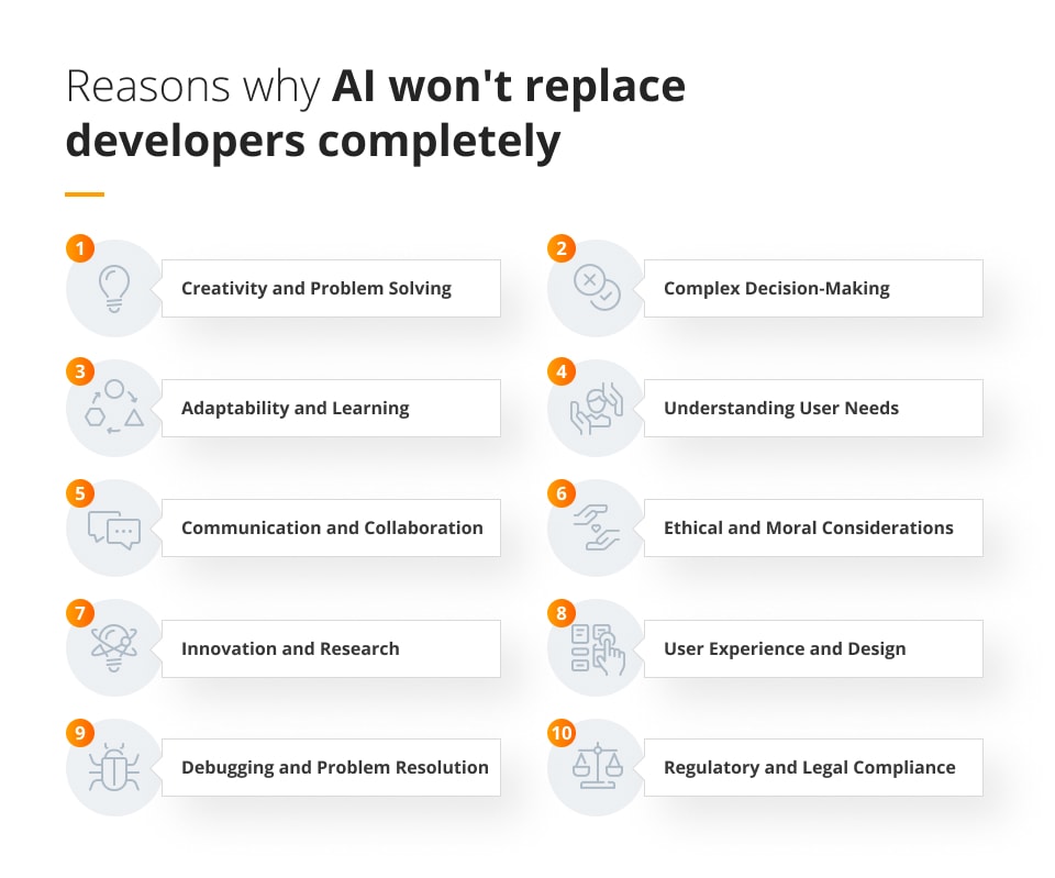 Understanding and empathising with user needs, preferences, and experiences is a human skill that is difficult for AI to replicate. Developers play a crucial role in creating user-centric software. - Communication and collaboration