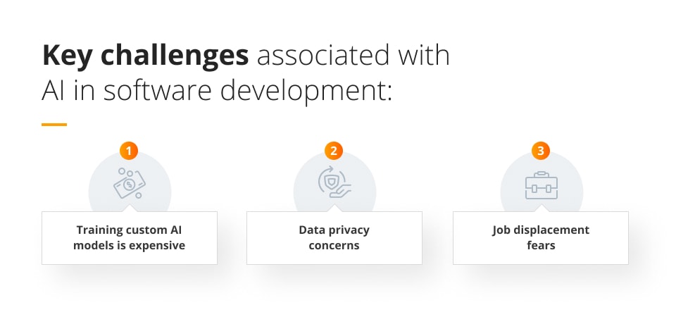 While AI offers numerous benefits in software development, it also presents several challenges that need to be addressed for successful implementation.