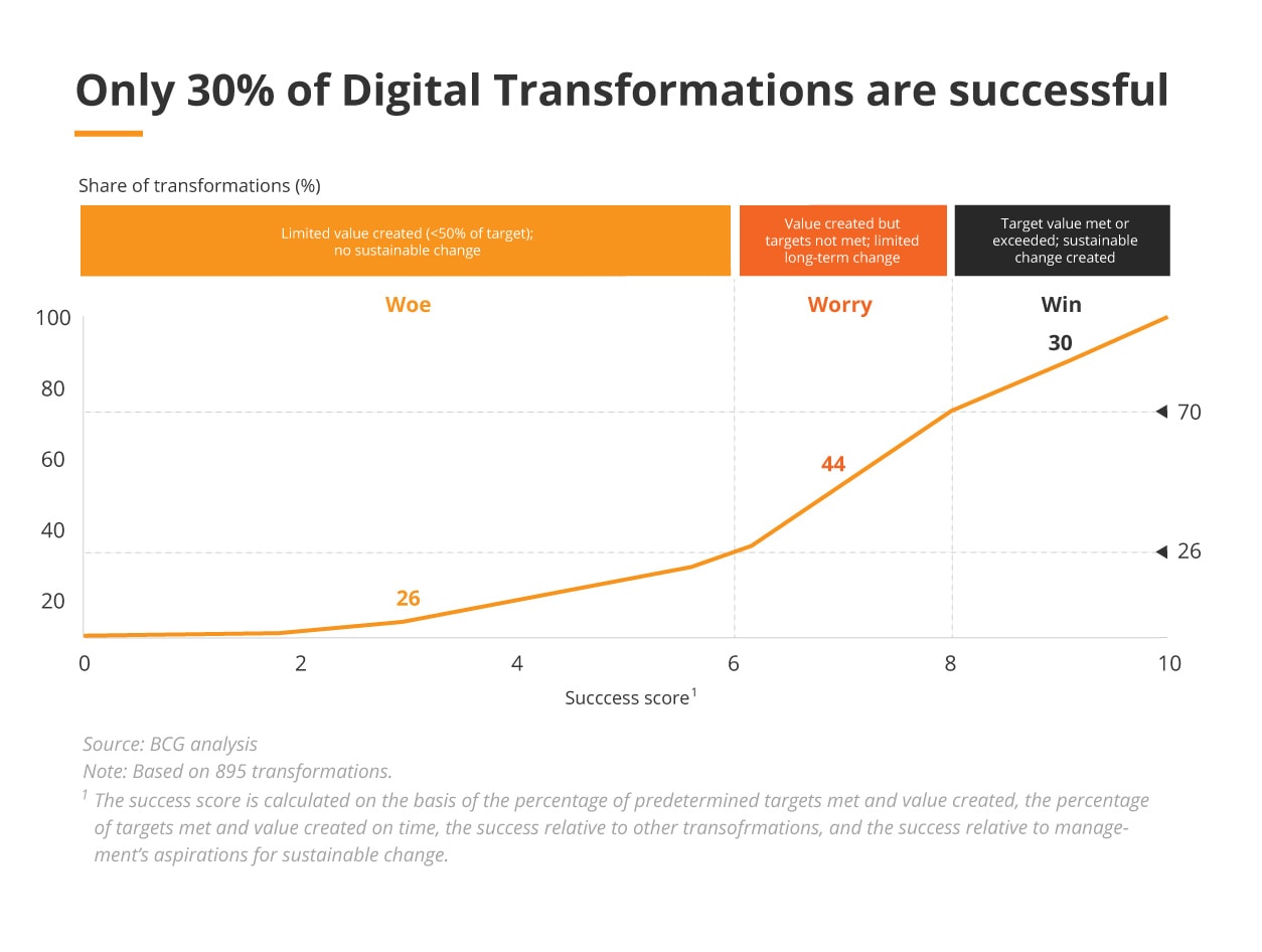 Studies show that a stupefying 70% of all digital transformations either fail or don’t manage to reach all of their intended goals!