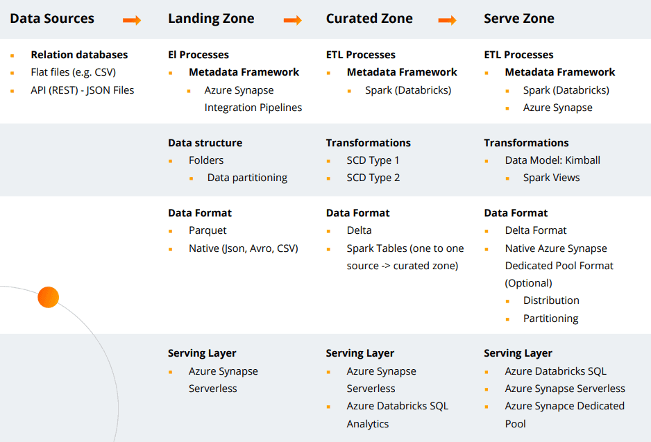 The concept of zones used in the Generic Metadata Framework is very similar to the solution building approaches promoted by Databrick (bronze, silver, gold zones). Thanks to the division into zones, data can be separated not only at the logical level but also at the physical level (dedicated containers on a data lake). It also defines precisely both the input and the output of each stage of data processing. Access to data from each zone is made possible by Azure Synapse Serverless.