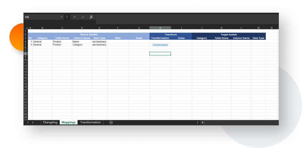- a transformations tab – if the required transformations are more complex, it is worth describing them in a separate sheet;