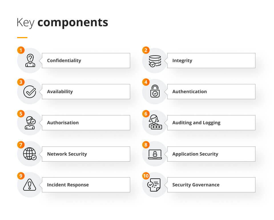 - Effective security architecture incorporates key components such as: confidentiality, integrity, availability, authentication, authorisation, auditing and logging, network security, application security, incident response, and security governance.