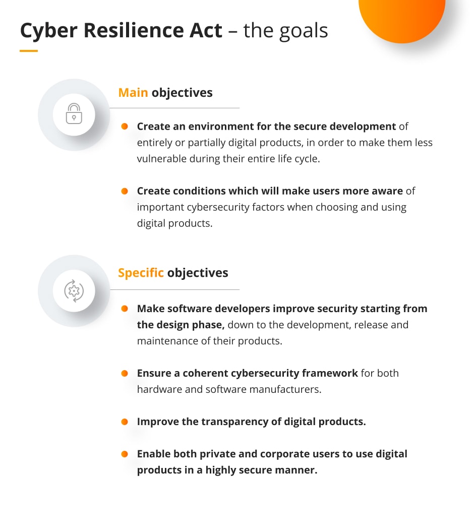 Law-makers have outlined two general and four specific objectives of the Cyber Resilience Act. The former focus on ensuring that the internal European market functions properly, while the latter basically revolve around creating a set of requirements for more secure coding.
